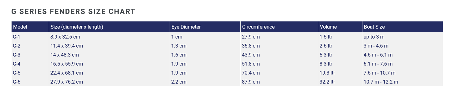 Τα μπαλόνια της σειράς G της Polyform ανέβασαν ψηλα τον πήχη για την ποιότητα και την εμφάνιση. Προσυπογράφοντας τη φιλοσοφία ότι η ποιότητα δεν χρειάζεται να κοστίζει περισσότερο, συμπεριλαμβάνουν νευρώσεις για επιπλέον αντοχή, βαλβίδες φουσκώματος για μεγαλύτερα μεγέθη και ενισχυμένα σχοινιά για μακροχρόνια αντοχή. Τα ευέλικτα μπαλόνια της σειράς G διατίθεται σε μια ποικιλία χρωμάτων και μεγεθών επιτρέποντάς σας να δημιουργήσετε την εμφάνιση που θέλετε για το σκάφος σας.