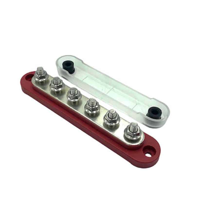 Μπάρα σύνδεσης με μονωμένη βάση, ακροδέκτες από ανοξείδωτο χάλυβα και διαφανές προστατευτικό κάλυμμα. 6 x M6 καρφίτσες με σπείρωμα. 150A 48VDC/300VAC.