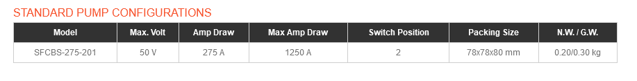 275A συνεχή, 450A διακοπτόμενη, 1250A με μίζα και 50V. Μπορεί να τοποθετηθεί σε εσοχή ή επιφανειακή.