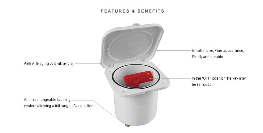 Διακόπτης Μπαταρίας που επιτρέπει ένα πλήρες φάσμα εφαρμογών. Από ABS, προστασία απο τον ήλιο και όλες τις καιρικές συνθήκες. Μπορεί να συνδεθεί είτε με το θετικό είτε με το αρνητικό ηλεκτρικό καλώδιο. Στη θέση “OFF” το κλειδί μπορεί να αφαιρεθεί.
